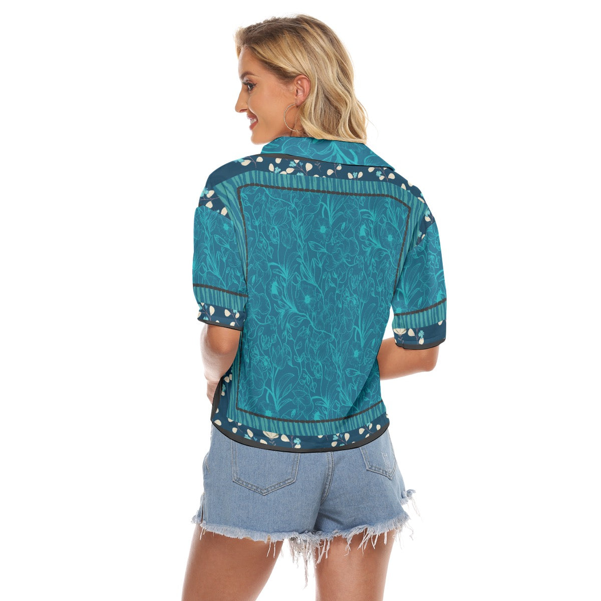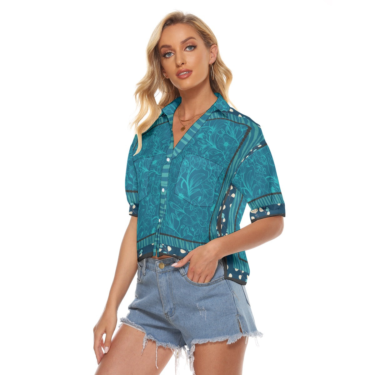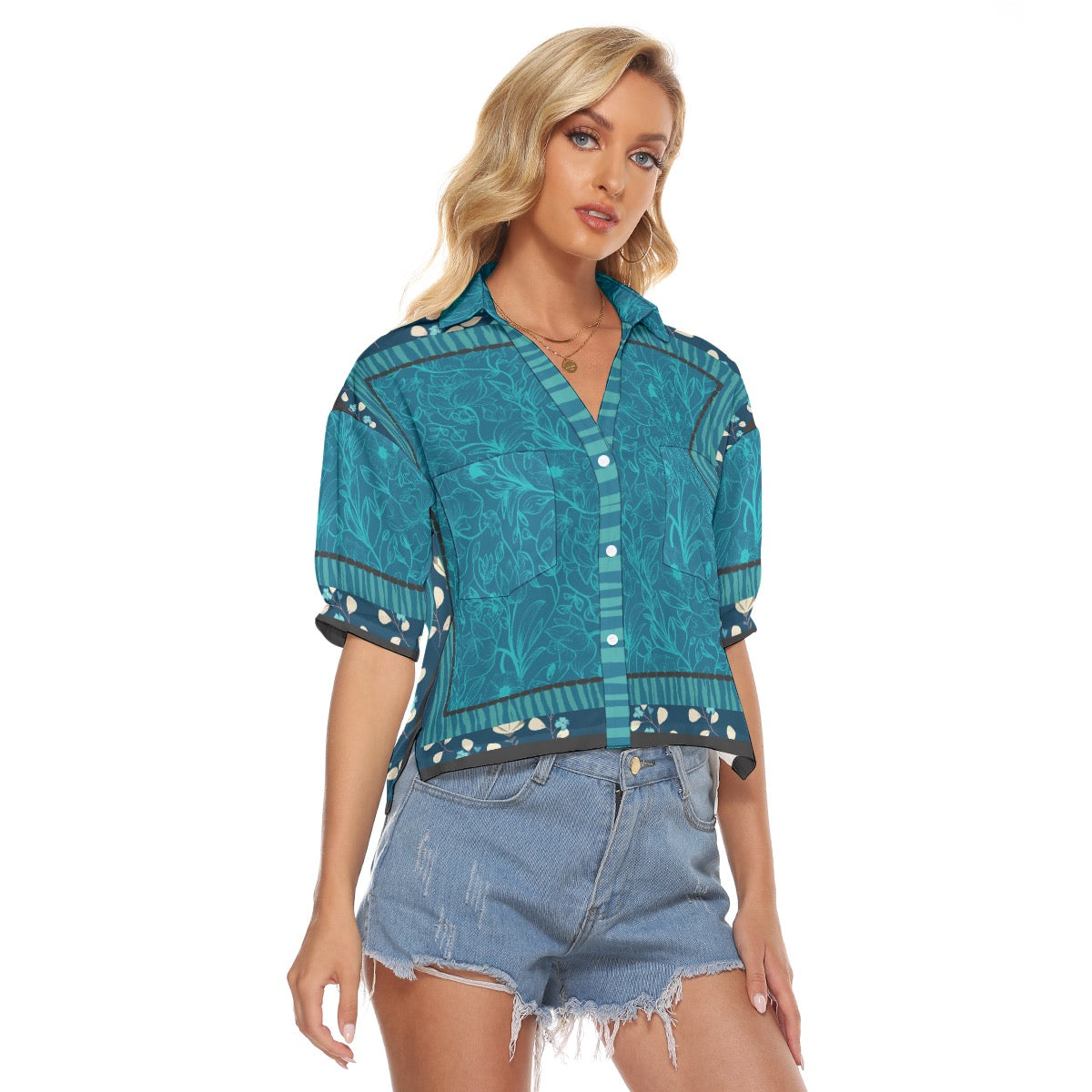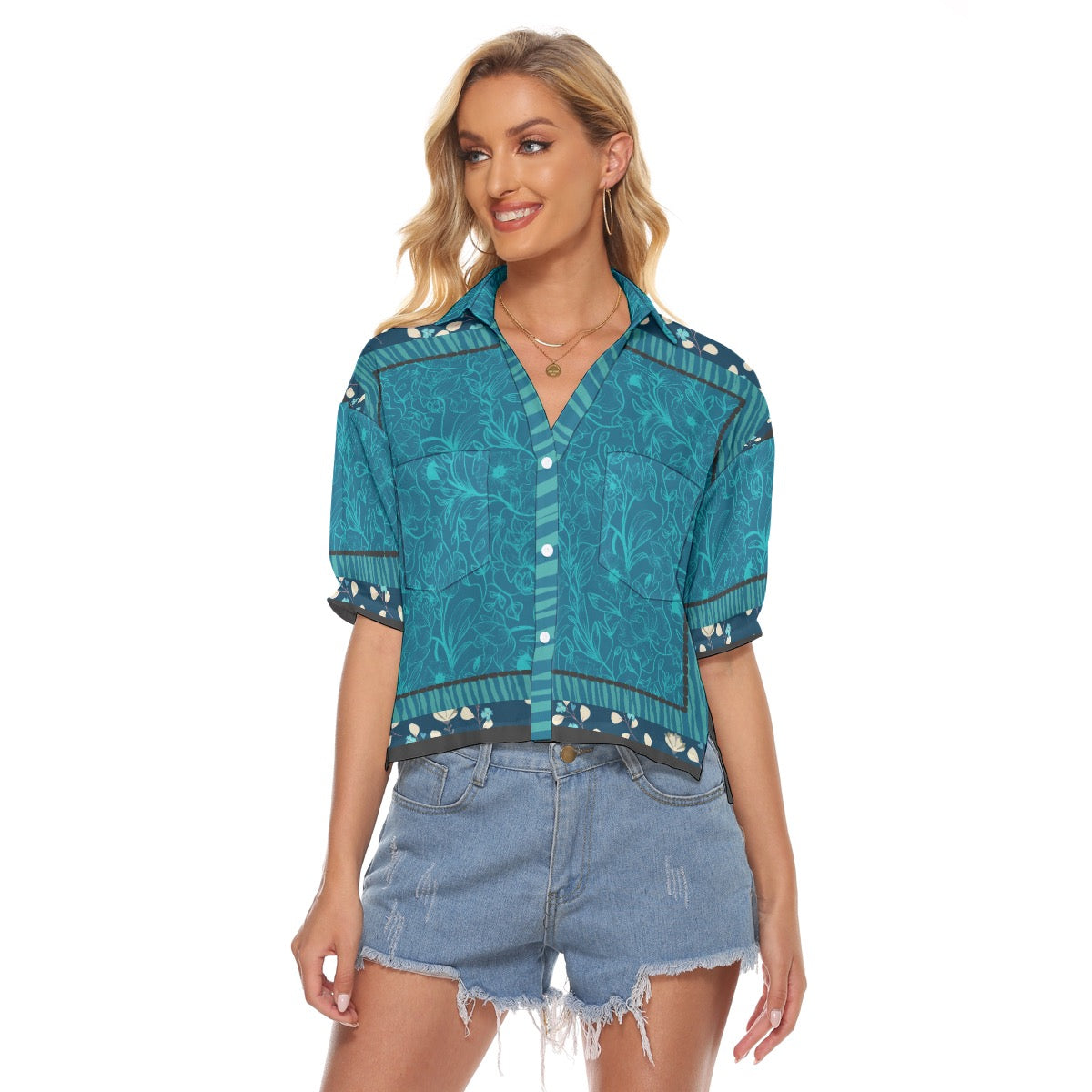 Blue flowers Stacked V-neck Short Sleeve Blouse. Miami Collection