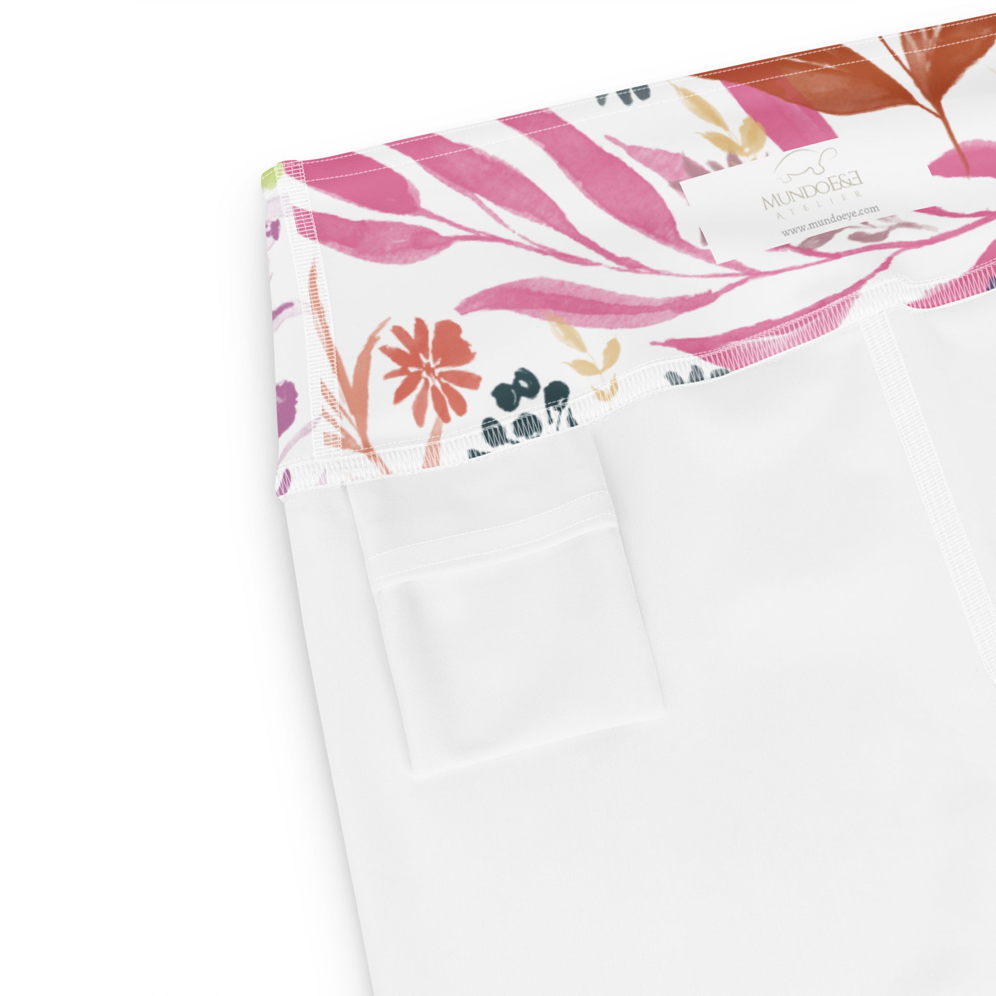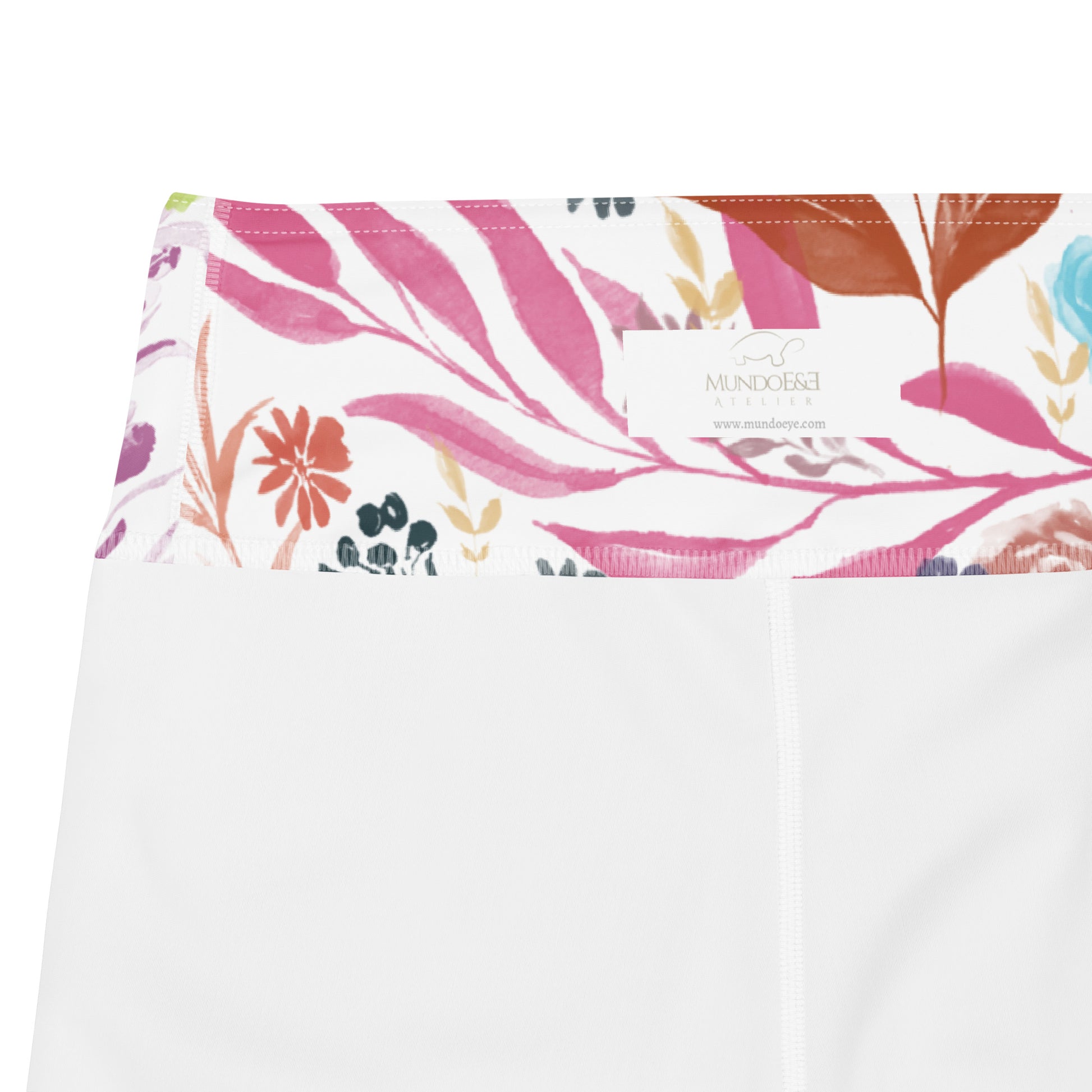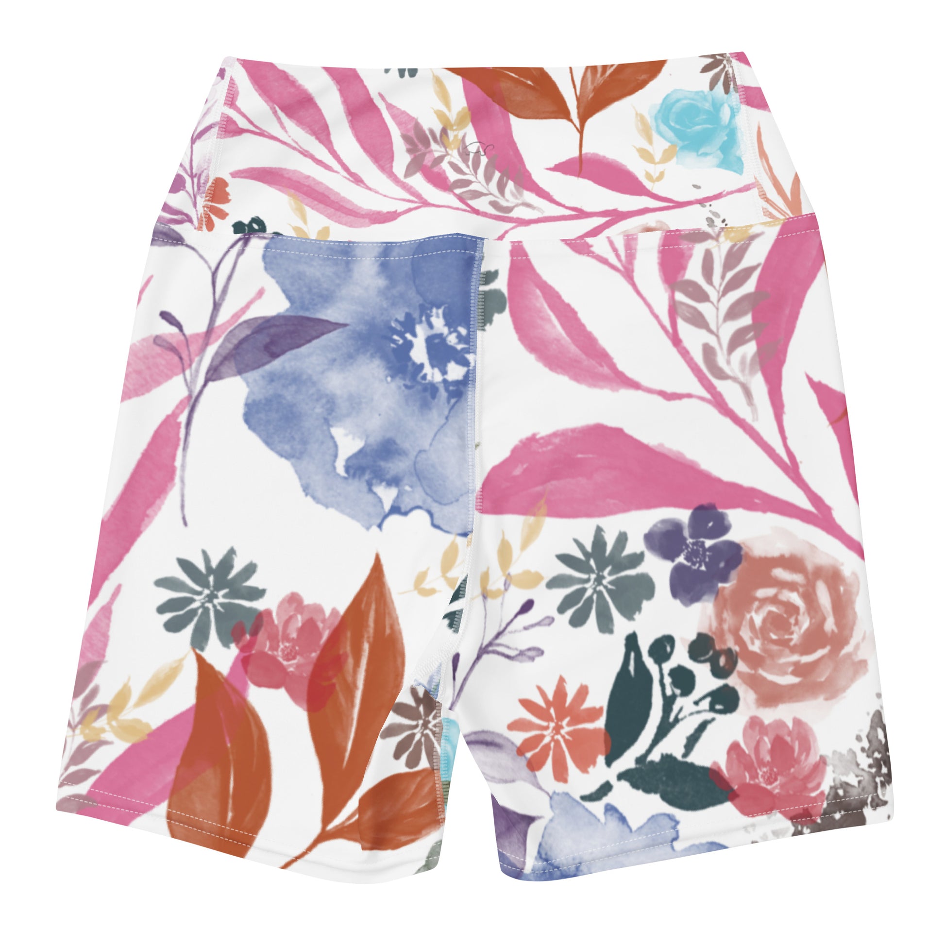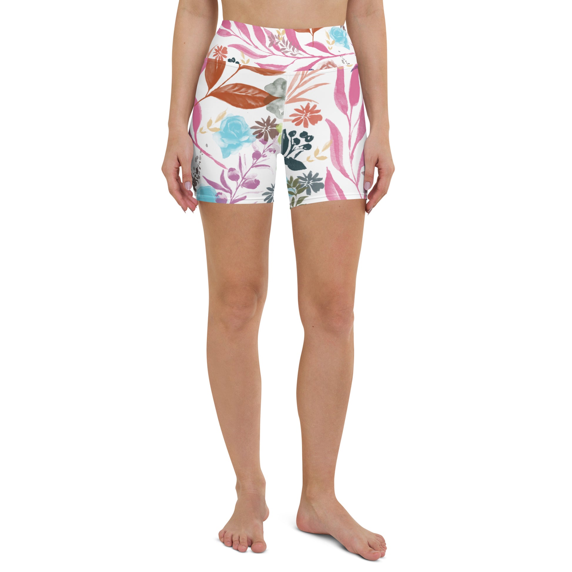 Multicolor Flowers White Yoga Shorts. Design hand-painted by the Designer Maria Alejandra Echenique